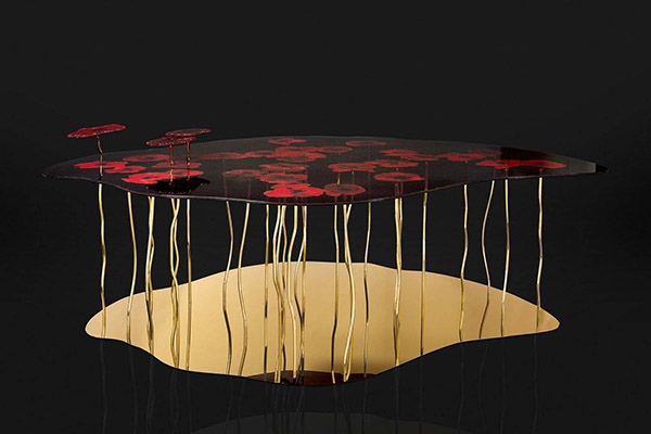 L’unicità è dovuta ad un approccio sperimentale che prima di tutto riguarda la grafica, il disegno del decoro, punto di partenza che determina e guida la forma di tutta la creazione (e non viceversa). La grafica del piano si armonizza poi con il disegno scultoreo del basamento, nel caso di tavoli, o delle strutture, se si tratta di trittici o di testate per letti. Il risultato è un prodotto percepito non come composto da più elementi ma come un unico “arredo artistico”.