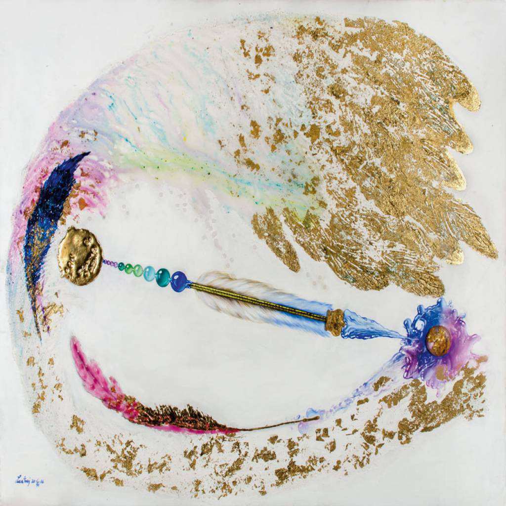 Tra le icone che compaiono spesso nelle opere di Lanteri c’è la corona, che domina anche le immagini presenti nell’opera ”I custodi del tempo”, dove le piume si trasformano nelle lancette di un orologio che segna lo scandire del tempo, mentre un uovo rotto scivola da una conchiglia verso uno sfondo verde acqua, a ricordarci che la vita viene dal mare.