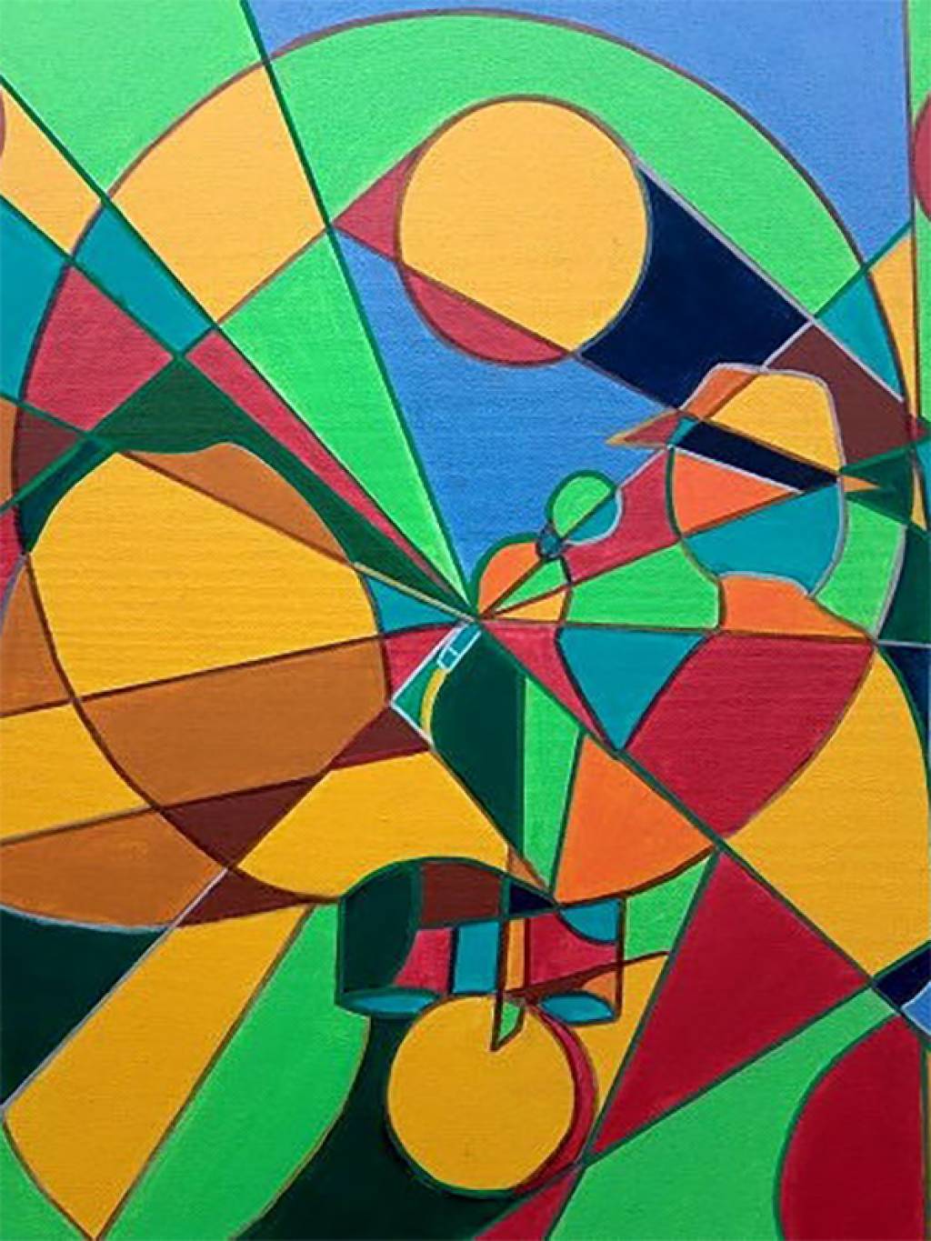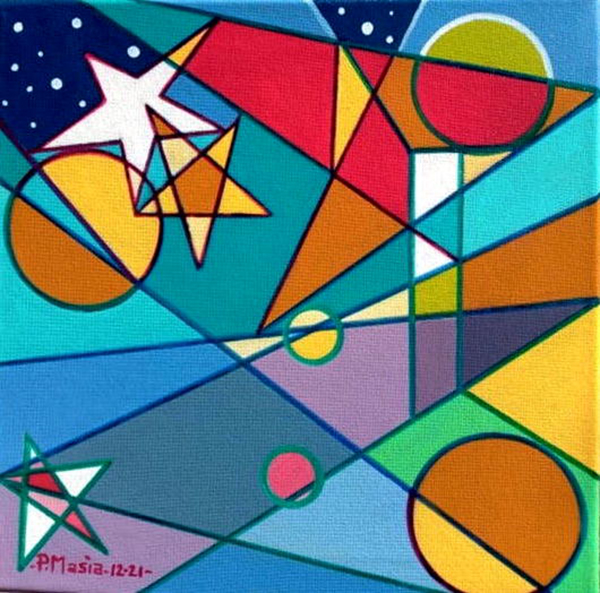Qualcuno ha detto, azzardando non poco, che l’astrazione è più fredda della figurazione. A parte la differenza, ormai superata da decenni, tra le due forme di espressione artistica, possiamo affermare con certezza che in Masia l’astrazione è la esatta esaltazione delle tinte, perché nelle sue geometrie infila colori decisi e figli di una dotazione legata alla sua terra d’origine. Il turchese, il giallo, quei bruni corposi, il verde smeraldo e le sue tonalità derivanti, l’azzurro nitido sbucano dai colori della terra di Sardegna e prendono giusto spazio nella giusta forma, facendoci tornare in mente il colpo di cassa del batterista esperto che serve a richiamare la disattenzione del gruppo sul ritmo giusto. E nella vita, come nella pittura, perdere il ritmo sarebbe fatale.