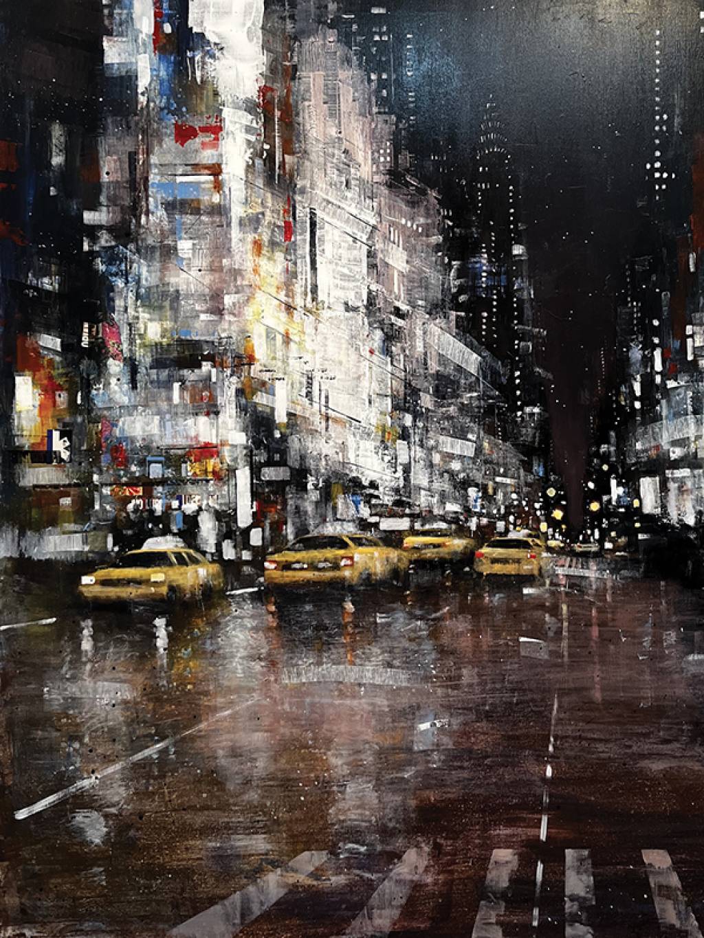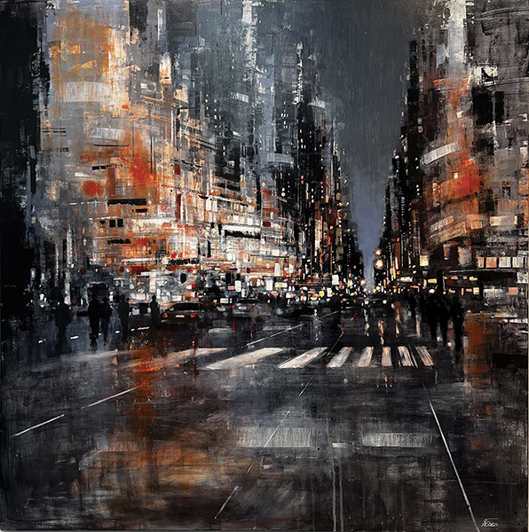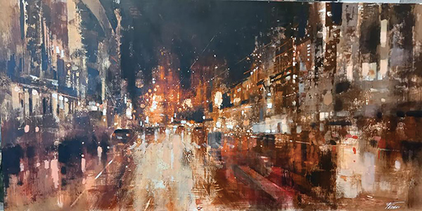 I riflessi delle luci dei fari delle automobili sul selciato, quelli delle vetrine illuminate, quelli delle finestre e della illuminazione urbana formano una scena integrata ed integrante, un tutt’uno col racconto della pittura di Fedeli, e si possono leggere come una visione, sì, ma talmente più grande di quella ritratta, da diventare uno sguardo autentico sul contemporaneo di ognuno di noi. Il fragile uomo, in fondo, è quello che ha progettato e costruito, e quasi viene da chiedersi perché tanta velocità ci sta superando e, a volte ci schiaccia. Nelle vedute contemporanee ed urbane di Fedeli ci si può rifugiare per osservare col giusto distacco quella parte sentimentale che alle città, tutto sommato, rimane ancora.